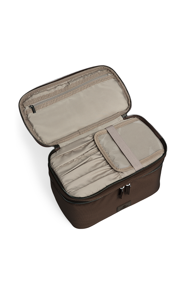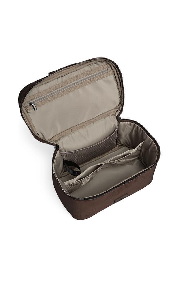 En funksjonell toalettmappe i vannavvisende, veganske materialer med praktisk inndeling og god plass. De separate rommene gir god oversikt og gjør den ideell til organisering av sminke og pleieprodukter – både hjemme og på farten.