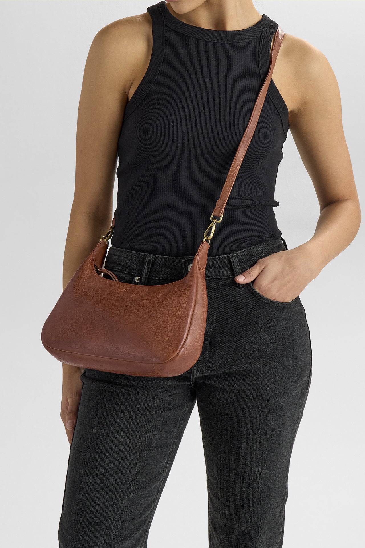 Elegant crossbody-veske med en myk, avrundet form. Vesken har et hovedrom med glidelåslukking og en innvendig glidelåslomme med god plass til hverdagens nødvendigheter. Den justerbare og avtakbare stroppen gjør vesken enkel å bruke både som skulderveske og crossbody.