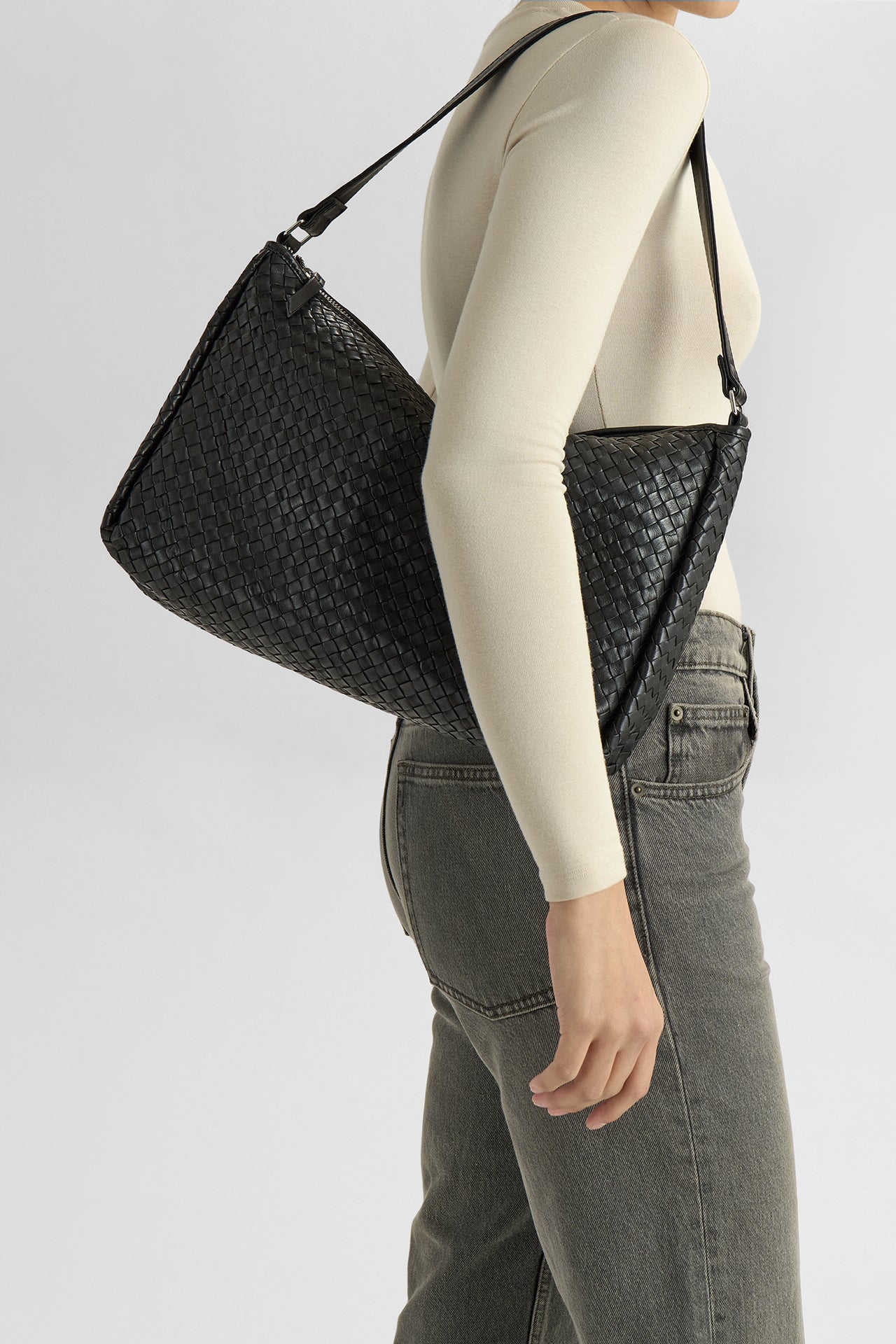 En romslig veske med flettet overflate og et mykt, elegant uttrykk. Det store hovedrommet lukkes med glidelås og gir god plass til hverdagens nødvendigheter.