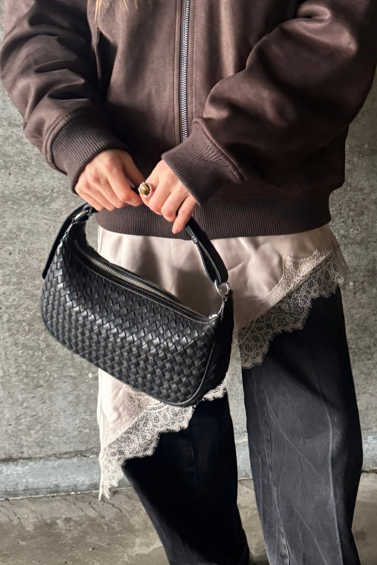Liten og stilren veske med håndflettet look – perfekt til det nødvendige i hverdagen.