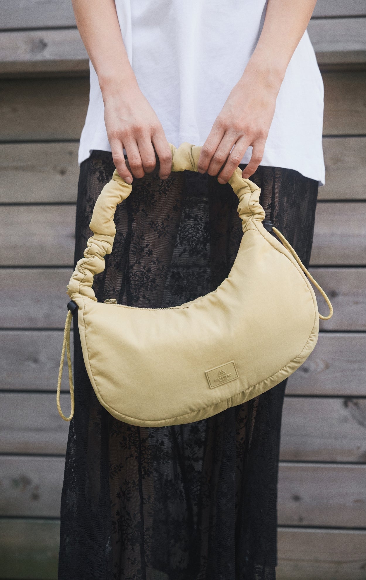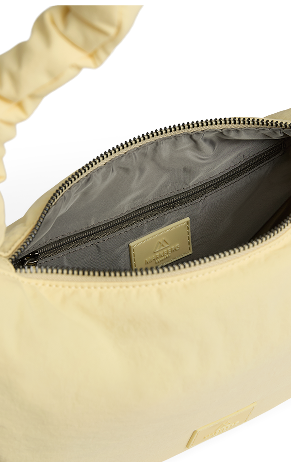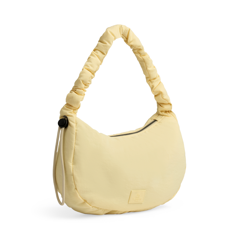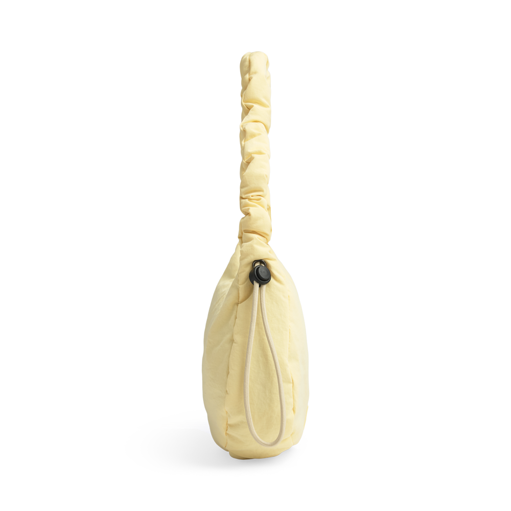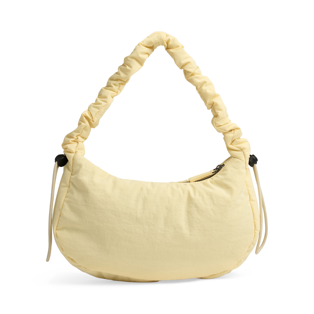 En elegant håndveske med et sporty preg - ideell til både hverdagsbruk og fest. Den rynkede, mykt polstrede remmen kan tilpasses med snøre og gir vesken et personlig og moderne uttrykk.