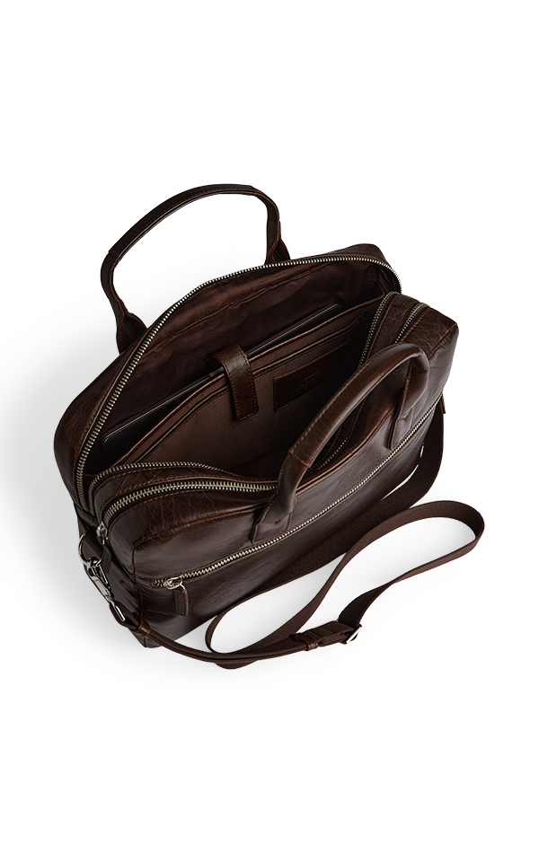 Tidløs og elegant PC veske i mykt kalveskinn. De to separate rommene gjør det enkelt å organisere både datamaskin, iPad og dokumenter – perfekt til både jobb og reiser.