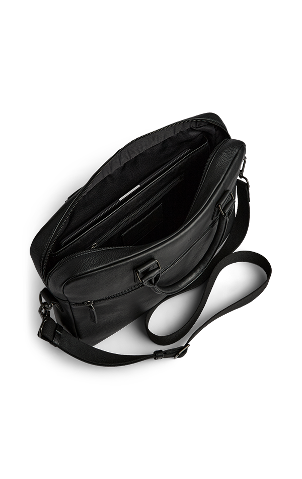 • Laget av ekte kalveskinn • Stort hovedrom med glidelås • Polstret rom med plass til laptop • Plass til 14" og 15" PC • Flere innvendige lommer til småting og penner • Glidelåslomme på fronten • Stropp på baksiden for feste på koffert • Avtakbar og justerbar skulderrem • To bærehåndtak • Slitesterkt fôr innvendig • Skinnets struktur og nyanse kan variere naturlig og gir vesken et unikt uttrykk