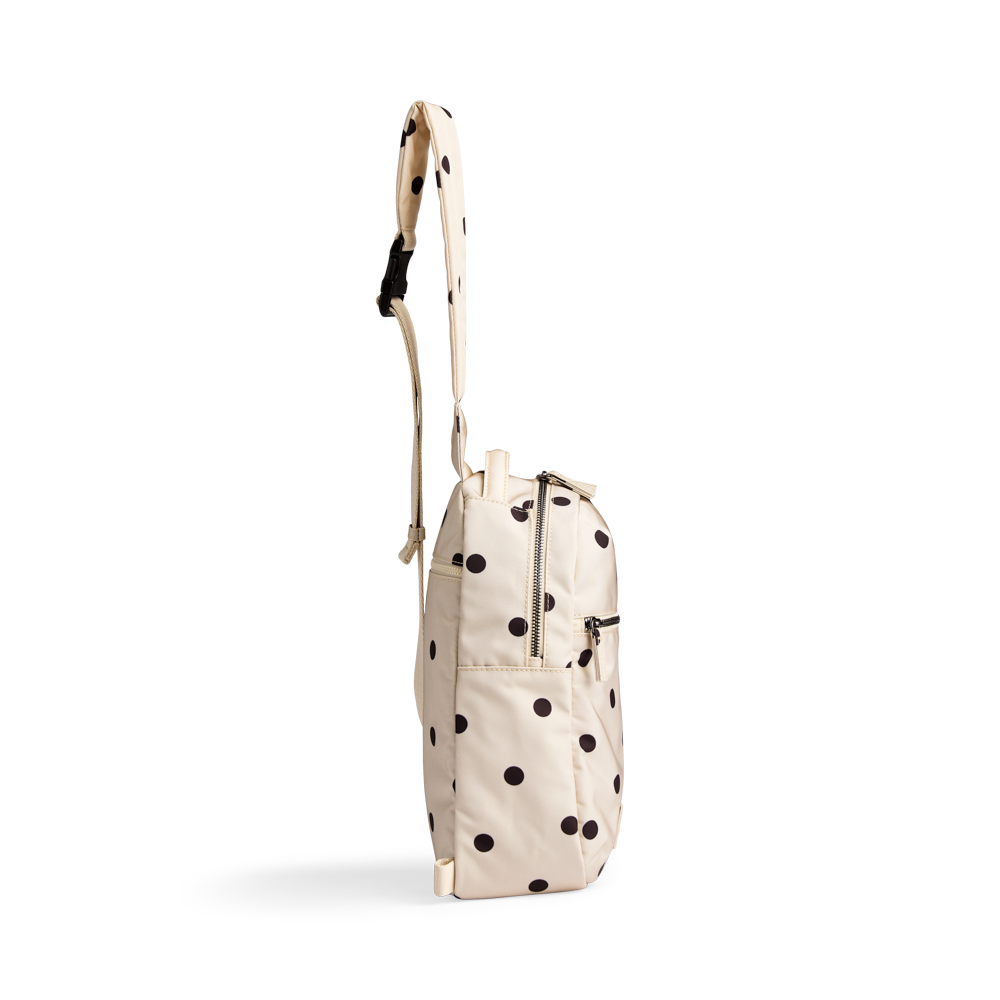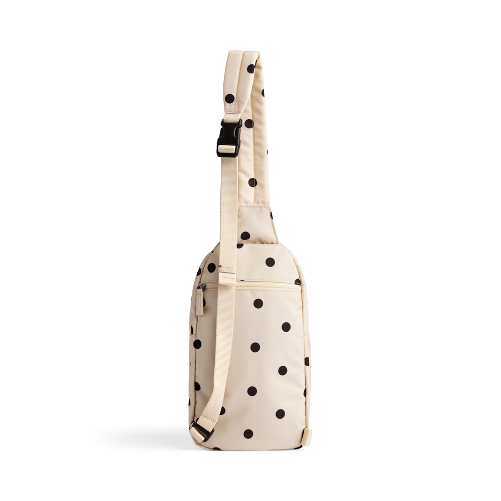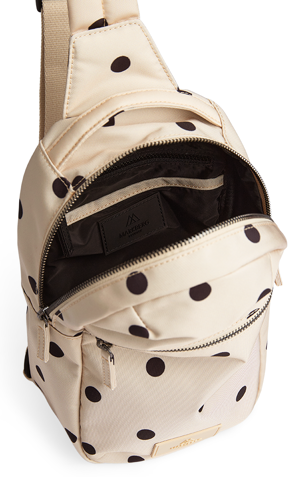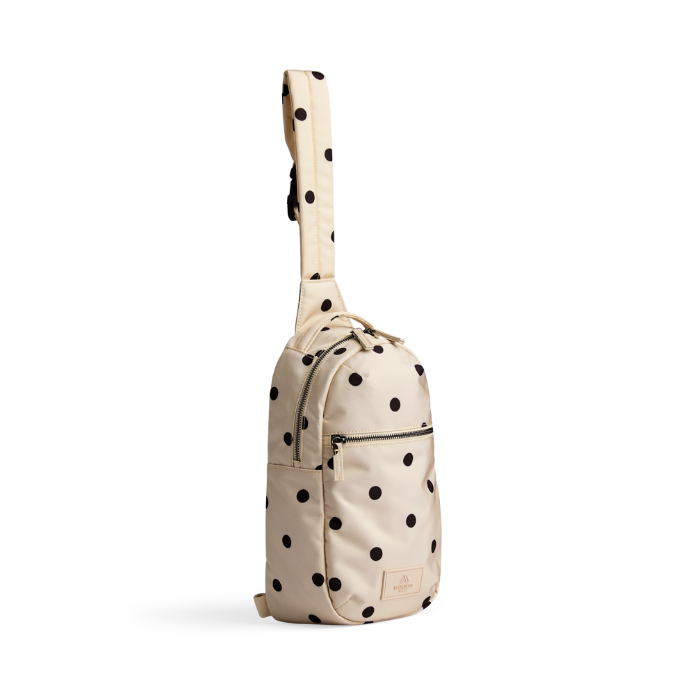 En moderne og funksjonell sling bag i slitesterke, veganske materialer med vannavvisende finish og elegante gulldetaljer. Det gjennomtenkte designet gir optimal komfort og god plass til hverdagens nødvendigheter på farten.
