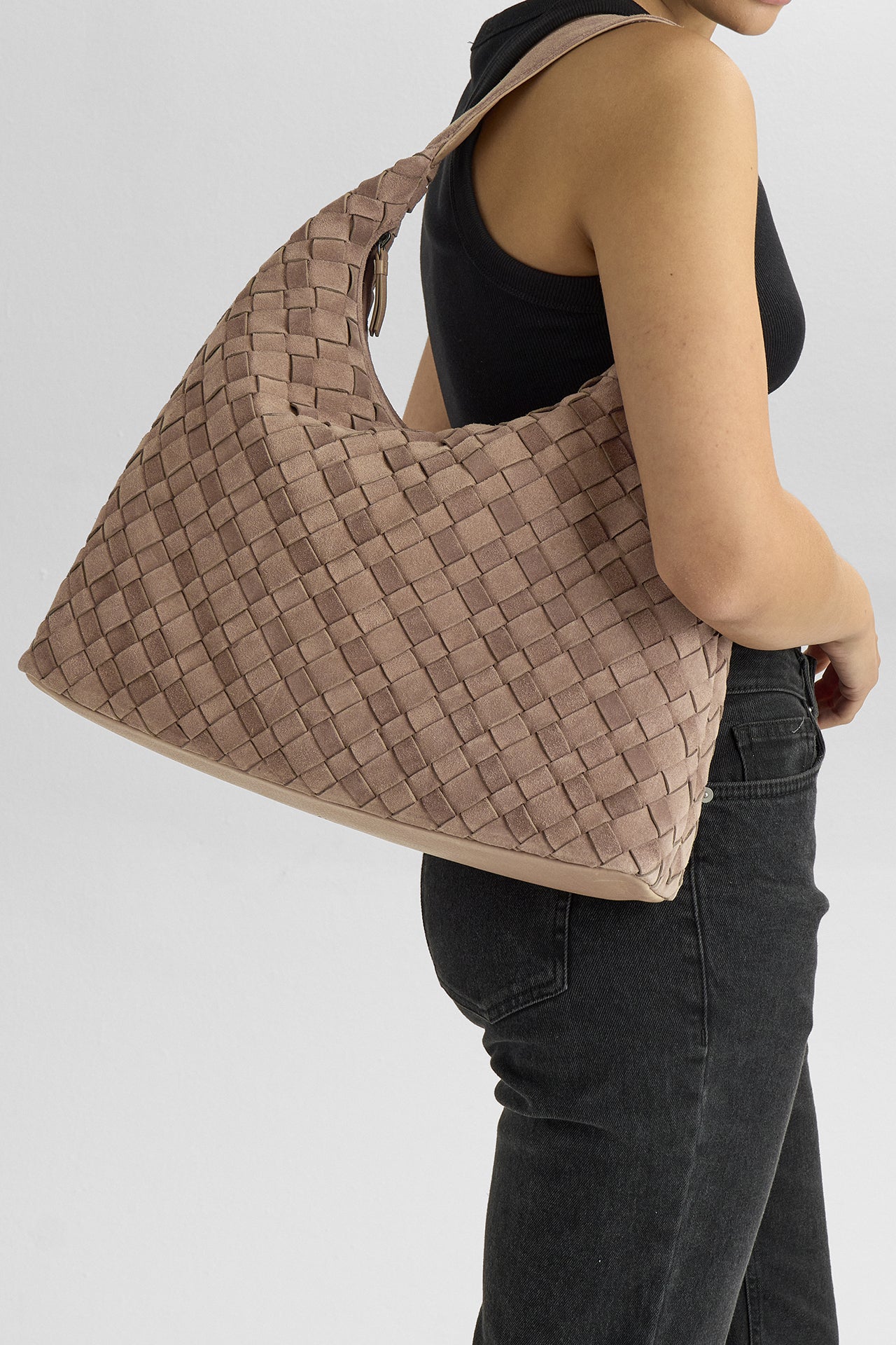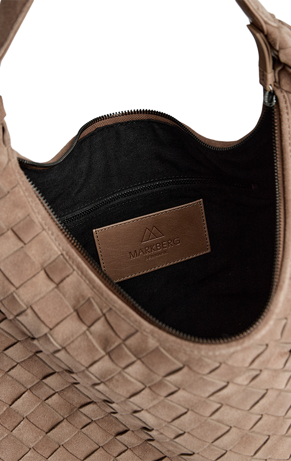 En romslig veske med håndflettet semsket overflate og et mykt, avslappet uttrykk. Det store hovedrommet lukkes med glidelås og gir god plass til hverdagens nødvendigheter. Vesken bæres komfortabelt over skulderen og er et stilfullt valg til både hverdag og jobb.
